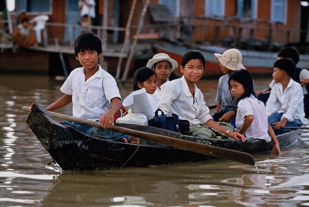 Hiring a boat to take us upriver to photograph fishermen and arriving at a floating schoolhouse as the children are getting out of school. Not going home in cars, not bikes not on foot but by