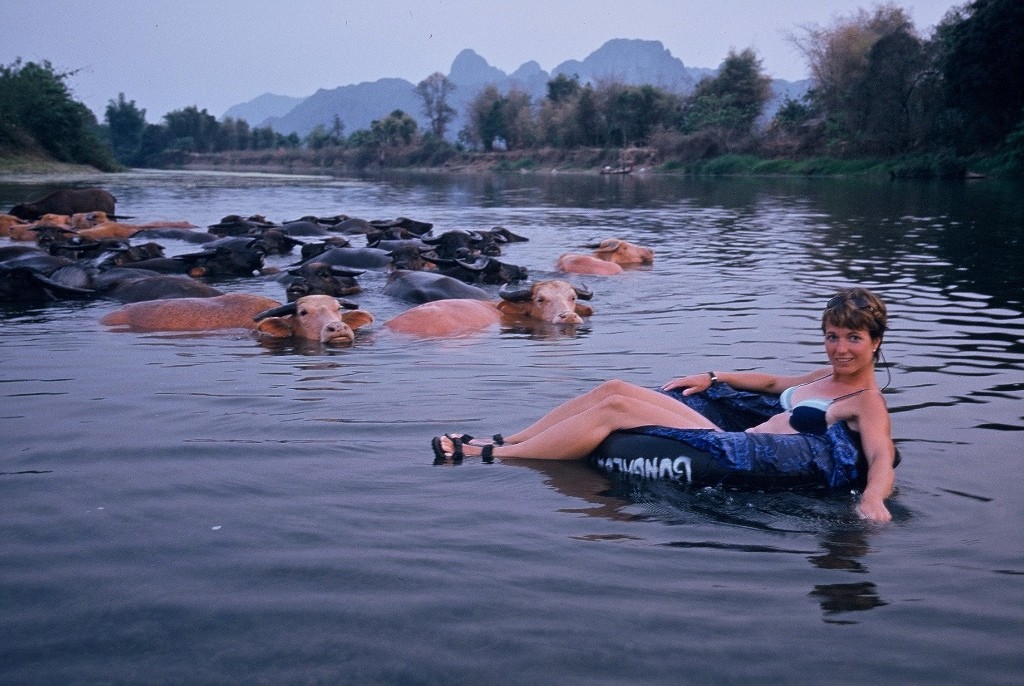 river we got out and floated back down in inner tubes. We floated within a few feet of water buffalo herds lying in the shallows and were hoarded by the village children that wanted
